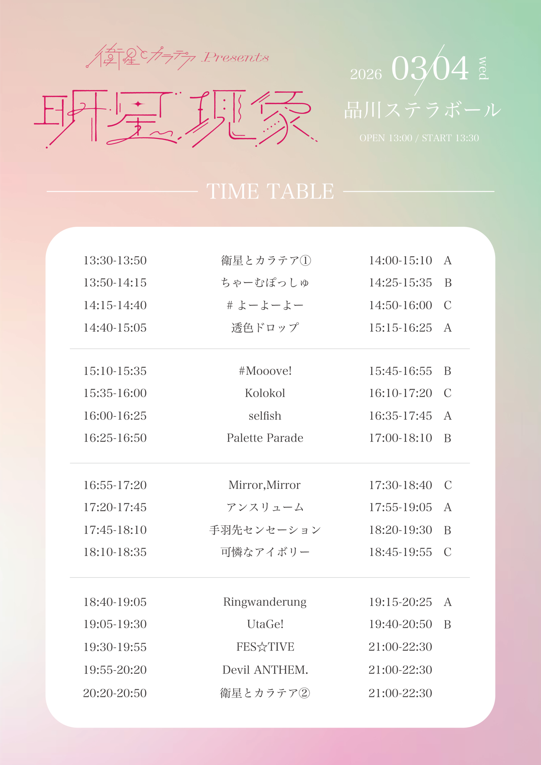 衛星とカラテア / アンスリューム / UtaGe! / 可憐なアイボリー / Kolokol / 透色ドロップ / selfish / ちゃーむぽっしゅ / 手羽先センセーション / Devil ANTHEM. / Palette Parade / FES☆TIVE / Mirror,Mirror /Ringwanderung / #Mooove! / #よーよーよー